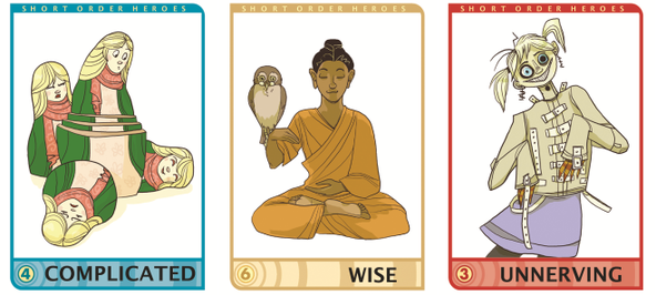 Short Order Heroes are a set of cards from Calico Games that are just art and a single trait or descriptor. You can draw as few or as many as you need. They map really well to aspects, distinctions, or similar characteristics. There are 108 cards in the base deck. Expansion decks are horror, science fiction, fantasy-flavored cards, and cards for relationships, events, and motives. I usually have Short Order Heroes on hand when I run a game to flesh out NPCs I come up with on the fly.
