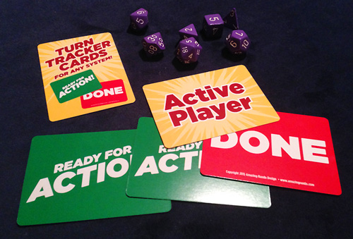 The Turn Tracker Card deck from Amazing Rando Designs (who manages the Fate SRD, Blades in the Dark’s site, and I don’t know what else) is 13 cards that help track whose turn it is. It has an active player card that is passed around and six cards for players to indicate if they are ready for their turn or done. The remainder of the cards are for GM characters with descriptions like Big Bad, Minions, Flunkies, etc. The deck is most useful for theater of the mind games that use “Balsera initiative” or don’t have initiative orders — like Fate, Cortex Prime, or Blades in the Dark.