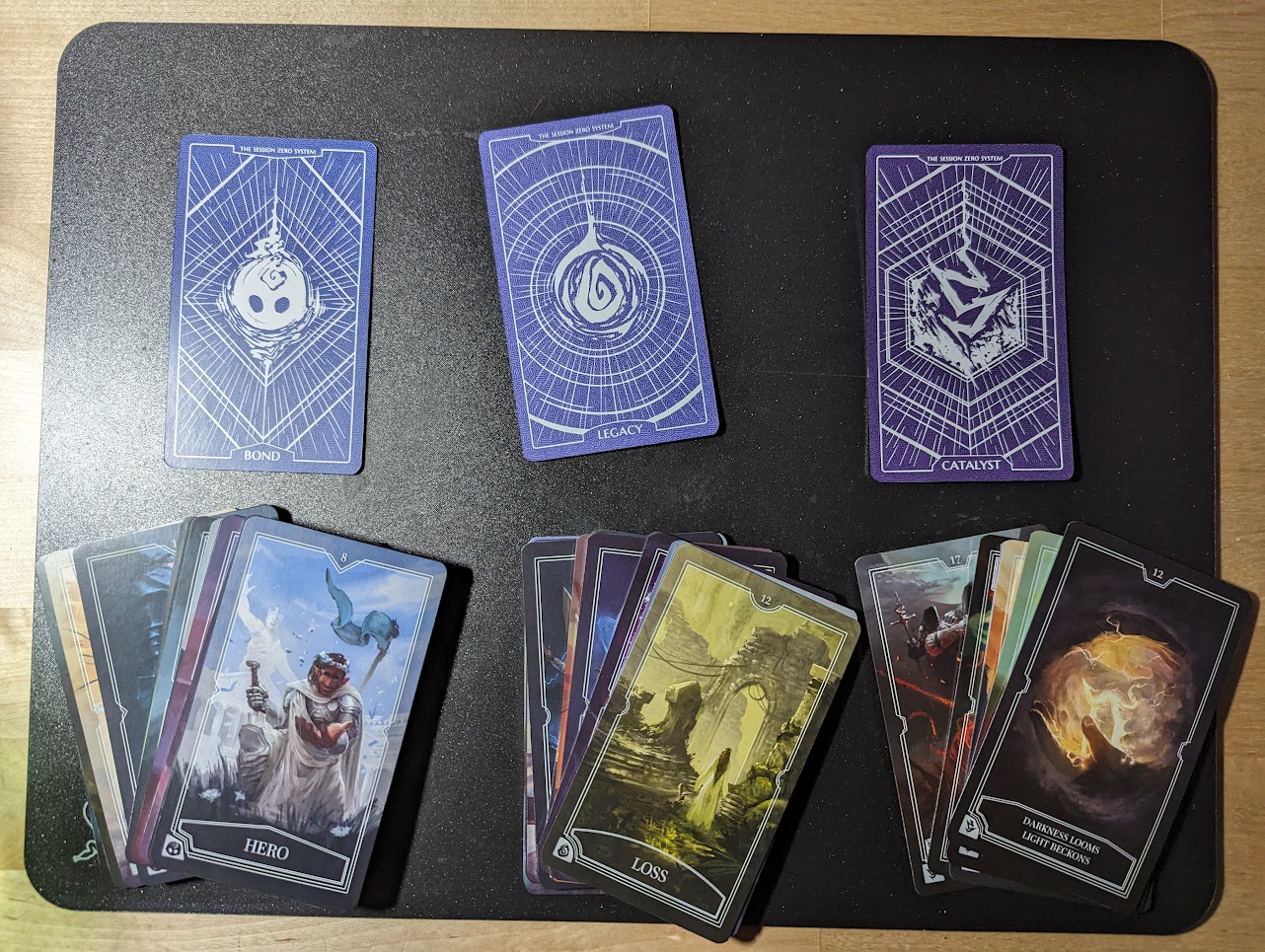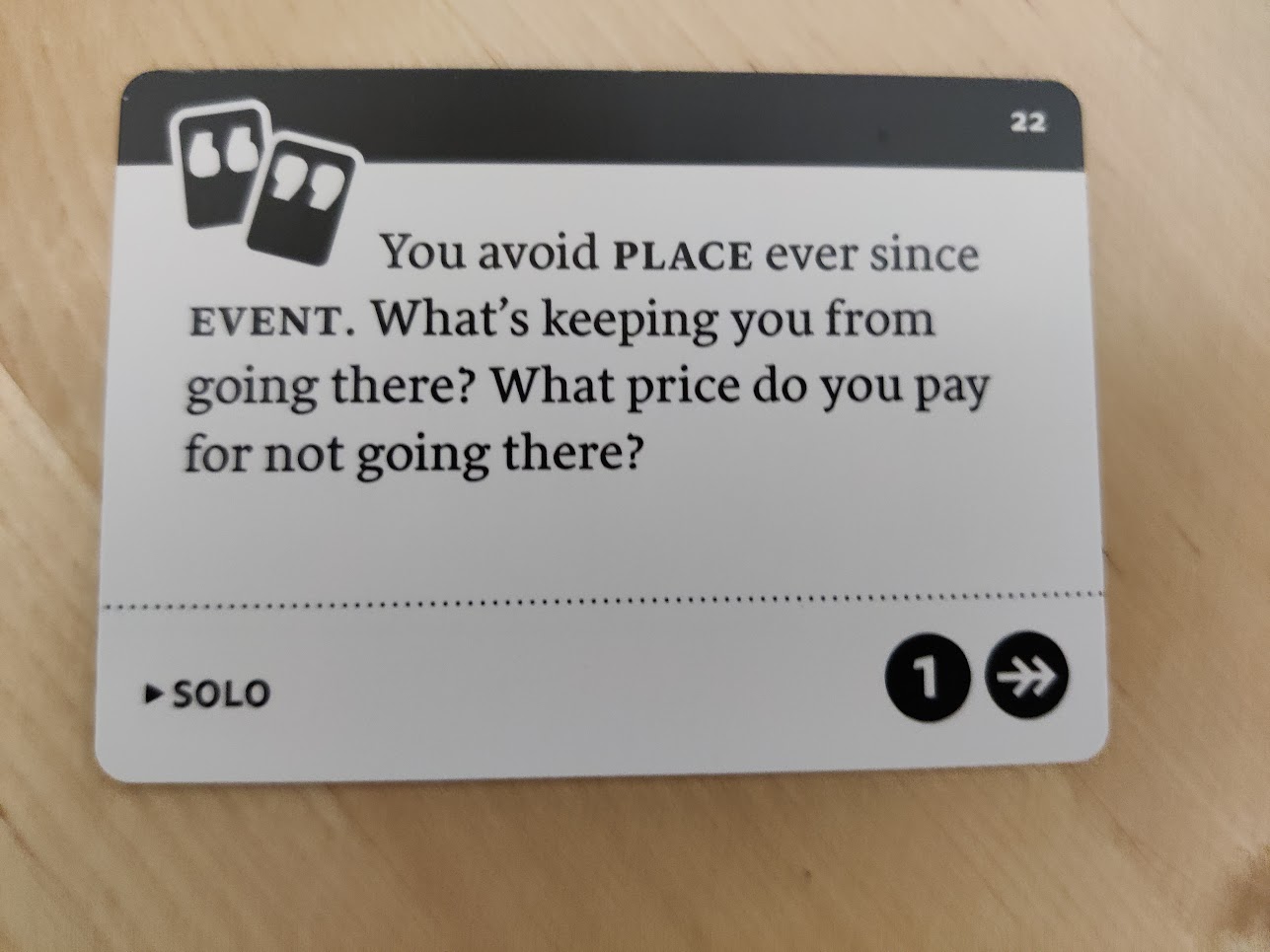 There has been a proliferation of card decks tailored to collaborative character generation. They’re great for drawing inspiration from while prepping and during play. Each deck has a different tone and focus for their prompts. This lets me choose the appropriate deck for the game I want to run.