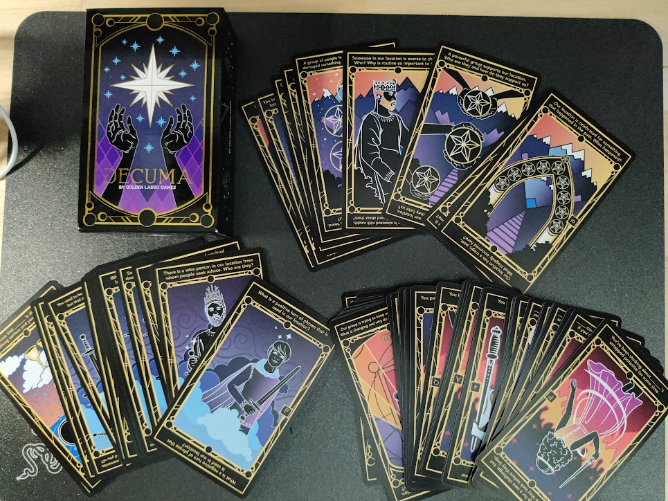 Decuma is a standard-sized tarot deck from Golden Lasso Games that functions similarly to Backstory Cards. However, the flavor of the cards is different. Unlike Backstory Cards, Decuma cards are drawn and interpreted in phases that help establish the player characters’ relationship to each other and the game’s setting (in this context, “setting” means where the game takes place versus the entire world). While the Decuma deck itself has gorgeous art, the booklet with the cards lists the card prompts with their corresponding tarot card, allowing it to be used with a regular tarot deck.