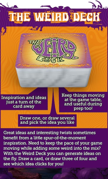 The Weird is a book from Monte Cook Games that is thousands of entries in tables of things that are just…weird. A 100-card deck was produced for it, which, unsurprisingly, I sprung for. Unlike the decks that Monte Cook Games have made for the Cypher System, Numenara, or The Strange, the Weird Deck is system agnostic. The book is available, but the cards still need to be delivered.